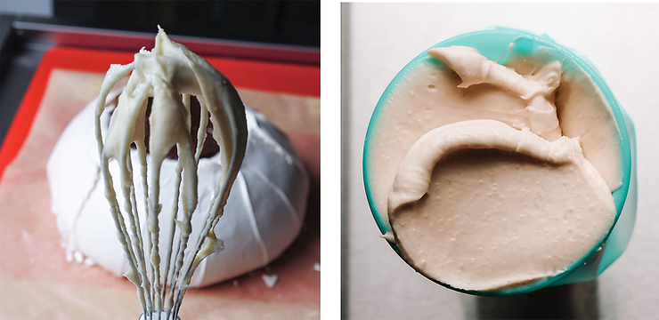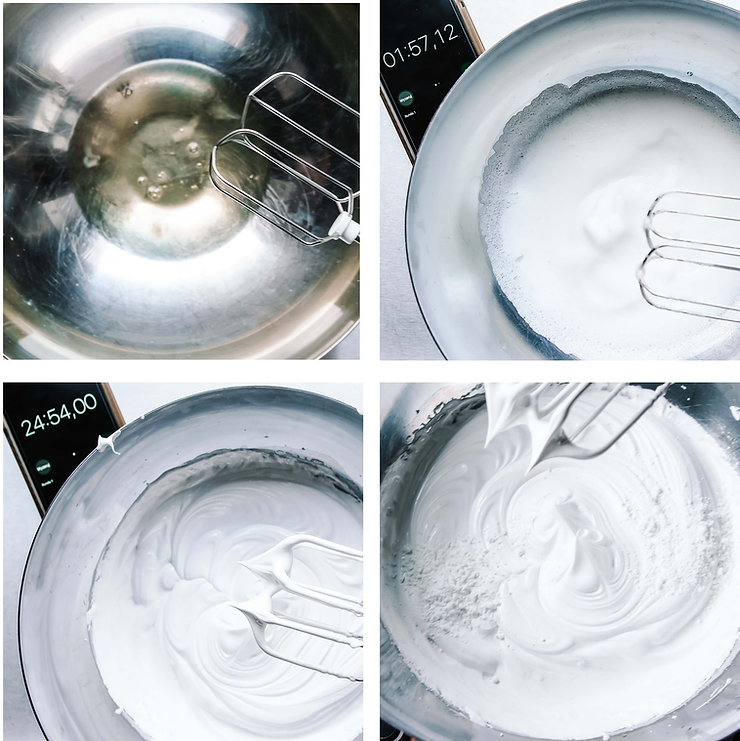 Po dodaniu całej ilości cukru, ubijaj bezę na średnich obrotach. W zależności od: rodzaju cukru czy temperatury białek ten etap potrwa od 10 nawet do 30 minut. Beza jest gotowa kiedy osiągniesz poziom „sztywnych wierzchołków”. Wyciągnij rózgę z bezy. Wystające końcówki bezy są sztywne i nie opadają, beza się błyszczy, nie czujesz cukru kiedy rozcierasz bezę pomiędzy palcem wskazującym a kciukiem? Twoja beza jest gotowa. Wskazówka Ady: beza ubijana za długo, pomimo że jest sztywna, nie będzie stabilna podczas pieczenia. Wypieki na takiej bezie będą nieudane. Czas trwania: 10 – 30 minut minut.