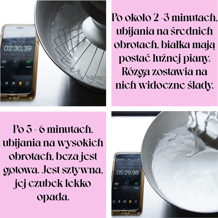 Białka z cukrem przełóż do misy miksera. Przez 30 sekund ubijaj na niskich obrotach. Następnie zwiększ obroty na średnie. Ubijaj do momentu, aż rózga będzie zostawiała widoczne ślady na bezie. Ten etap trwa około 2 – 3 minuty.