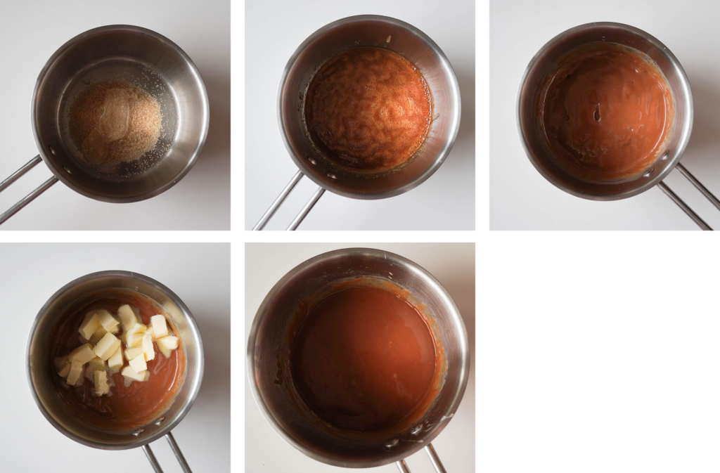 Gdy cukier jest skarmelizowany, a mieszanka mleczna – gorąca, możesz zacząć powoli dolewać śmietankę z mlekiem do karmelu. Mieszaj rózgą bardzo intensywnie do momentu połączenia składników. Dodaj resztę mieszanki i zdejmij karmel z kuchenki.