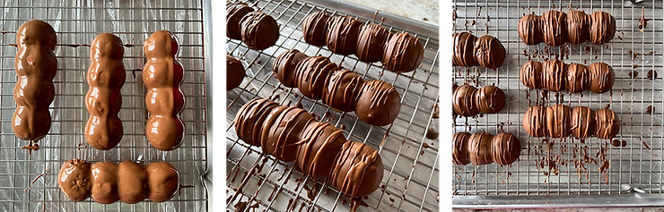 250 g mlecznej czekolady umieść misce, w której zmieści się ekler. Roztop ją w mikrofalówce. Pamiętaj o tym, żeby jej nie przegrzać. Nie przekraczaj 45°C Zanurz dwukrotnie eklera w czekoladzie. Następnie palcem zbierz nadmiar polewy, przejedź nim po całej długości eklera.