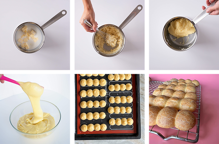 Dorzuć przesianą mąkę. Wymieszaj rózgą do połączenia. Odstaw na płytę grzewczą. Ustaw średnią moc. Podczas podgrzewania nie przestawaj mieszać ciasta szpatułką, aż do momentu powstania cienkiej warstwy z masy na dnie garnka. Gotowe ciasto powinno błyszczeć i być sprężyste. Ten etap trwa około 1 minuty.