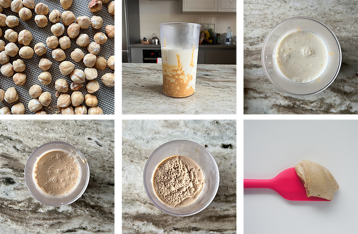 Umieść w malakserze bądź w Thermomixie. Miksuj na najwyższych obrotach. Kiedy orzechy będą miały postać pyłu, zmniejsz obroty. Cała mikstura zmieni konsystencję proszku na płynną. Mielenie trwa kilka minut.
