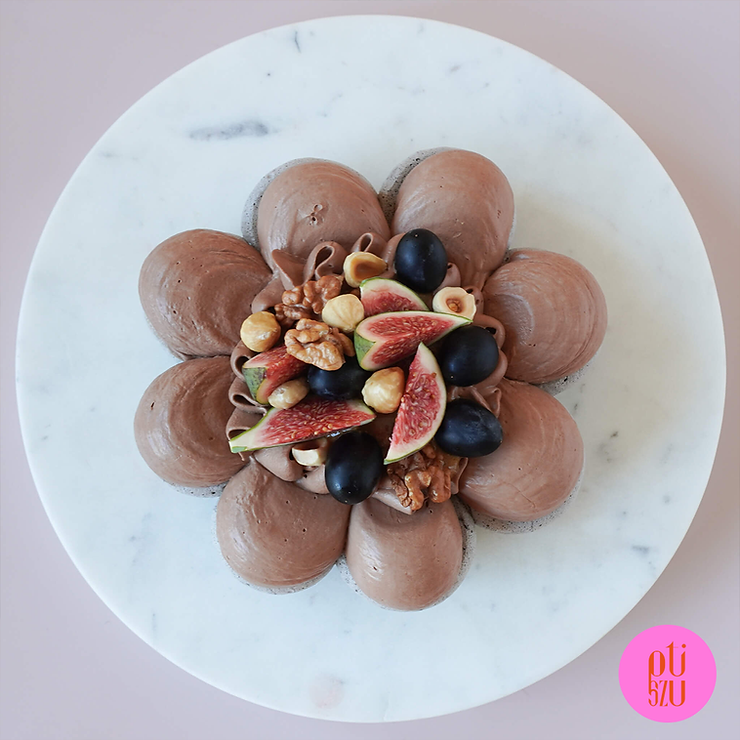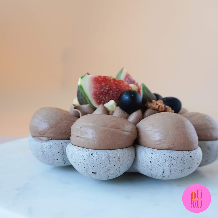 Beza kojarzy mi się z latem, wtedy serwujemy ją z prostymi kremami śmietankowymi i sezonowymi owocami. Dlatego na przekór trendom postanowiłam wykonać ten deser w wersji jesienno-zimowej. Beza ma nietypowy kształt, ale też kolor: odpowiada za niego czarne kakao. Do tego dobrałam krem na gorzkiej czekoladzie. Całość została uzupełniona praliną orzechową, orzechami, winogronami i figami. Pamiętaj, że możesz urozmaicić smak kremu dodając do niego skórkę z pomarańczy czy przyprawy korzenne.