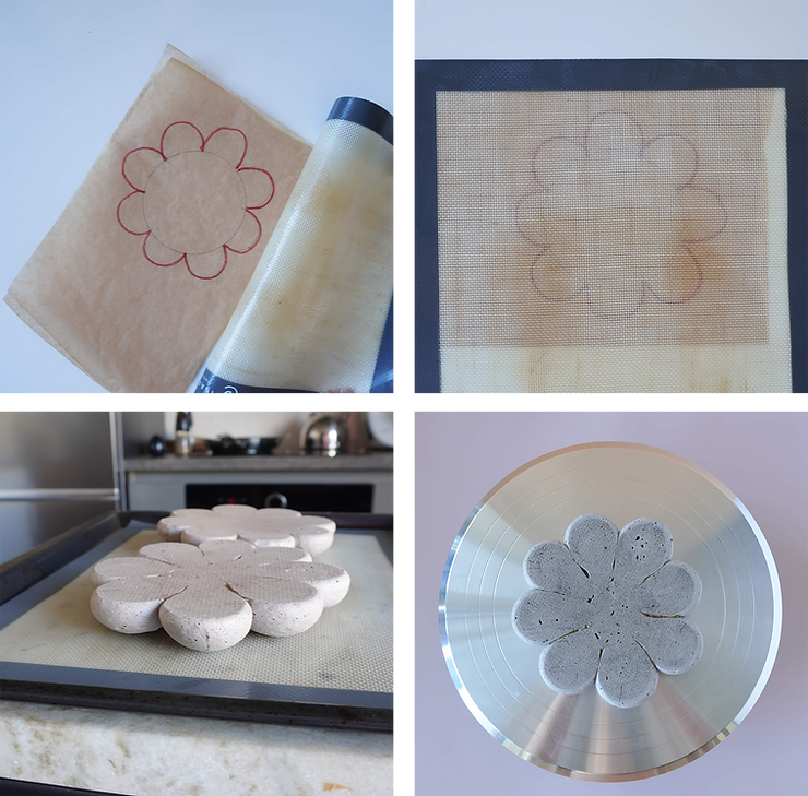 Przygotuj blaszkę, na której będzie pieczona beza. Blaszkę wyłóż papierem do pieczenia, na nim odrysuj kształt bezy. Potrzebujesz rantu cukierniczego lub talerzyka o średnicy 14–15 cm i okrągłej foremki o średnicy 4 cm. Najpierw odrysuj duży okrąg, następnie na jego obwodzie odrysuj półokręgi od foremek. Kształt, który uzyskasz, ma przypominać kwiatek.