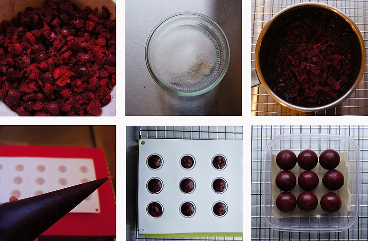 Przełóż całość do rękawa cukierniczego. Wyszprycuj wiśnie do formy silikonowej. Wskazówka Ady: używałam formy z półkulami o pojemności 17 g/ każda. Jeśli używasz takich form jak ja, napełnij formę do 3/4 jej pojemności. Moje wkładki wiśniowe były za duże. Po wyjęciu kul musowych z formy silikonowej, wiśniowa wkładka była widoczna na ich czubku.