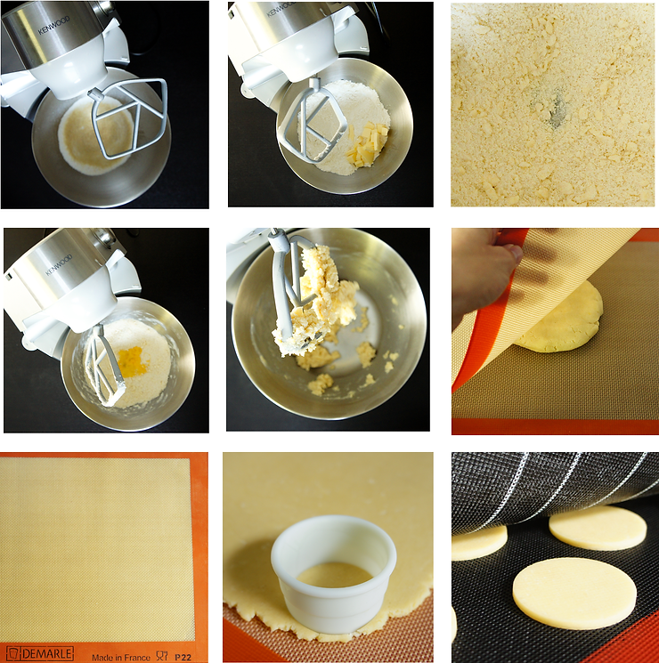 Wyciągnij placek z zamrażarki. Oderwij od obu arkuszy papieru/mat. Okrągłą wykrawaczką wytnij ciasteczka. Wskazówka Ady: ciasteczka muszą być odrobinę większe od monoporcji. U mnie podkładki z ciasta kruchego miały 6 cm średnicy.