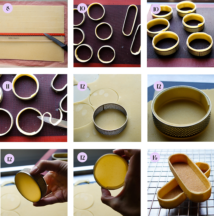 11. Twoje paski ciasta w foremkach chłodzą się, czas najwyższy wyciągnąć drugi płat ciasta. Odklej ciasto od maty, wykrój małe placuszki brzegiem foremki o tej samej średnicy, jak te w których pieczesz korpusy. Następnie weź foremką z paskiem ciasta w środku. Postaw foremkę na wykrojonej formie. Przyciśnij. W ten sposób dół przyklei się do bocznego paska. Wyrównaj ciasto w miejscu połączenia boków ze spodem ciasta. Odstaw korpusy w foremkach do zamrażarki na 30 minut, bądź do lodówki na 2 godziny.