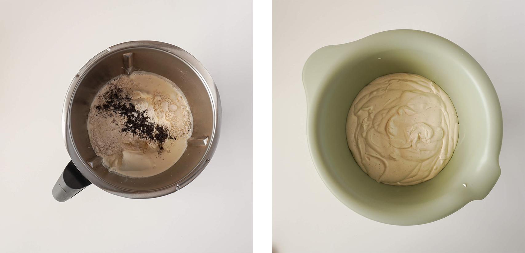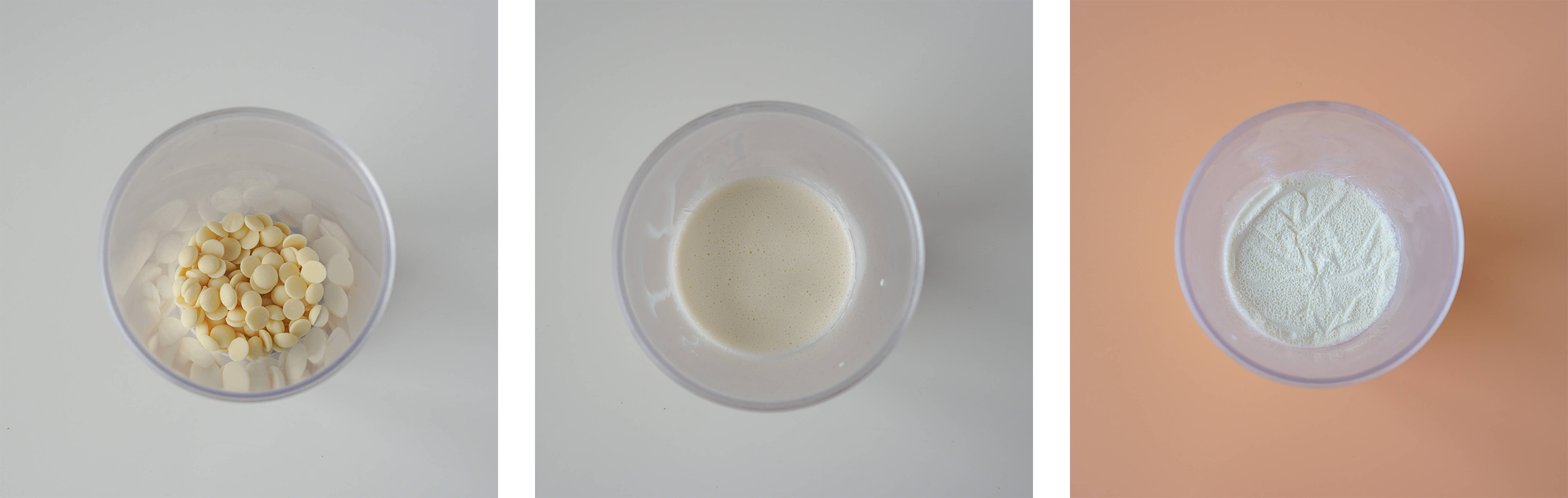 Wylej gorącą śmietankę na czekoladę. Odczekaj 3 minuty. Zblenduj. Dodaj zimną śmietankę B i zblenduj ponownie.