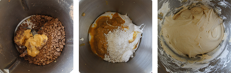 Druga warstwa (marshmallow): Przełóż fluff, cukier puder i masło orzechowe do czaszy miksera. Wymieszaj. Masa stwardnieje, to tylko tymczasowe. Warstwę marshmallow rozprowadź równomiernie na czekoladzie. Odstaw do lodówki.