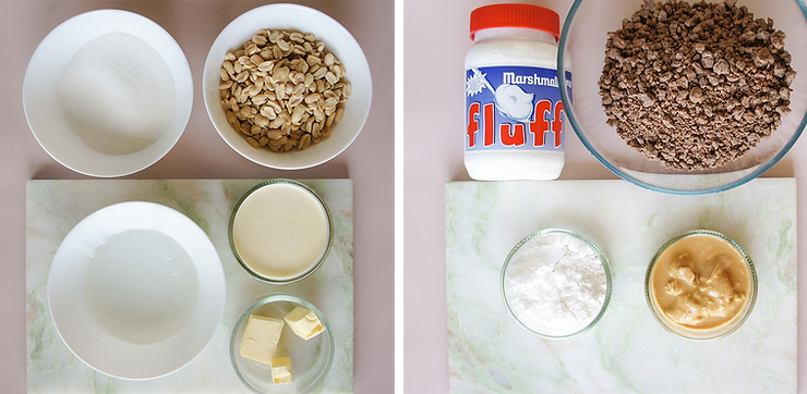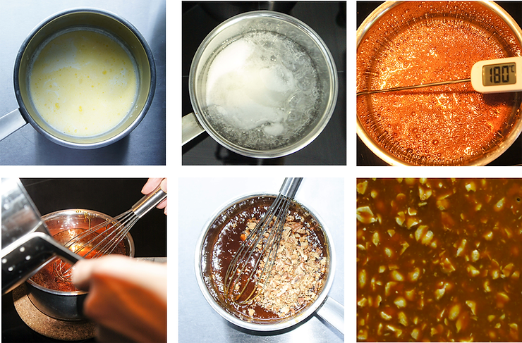 Trzecia warstwa (karmel): przygotuj karmel. Dokładny przepis znajdziesz tutaj. Po dodaniu do karmelu śmietanki, zagotuj go do 115 stopni. Potrwa to około 5 minut. Następnie dodaj orzechy. Wymieszaj. Natychmiast wylej karmel na warstwę marshmallow. Rozprowadź go równomiernie. Odstaw do lodówki.