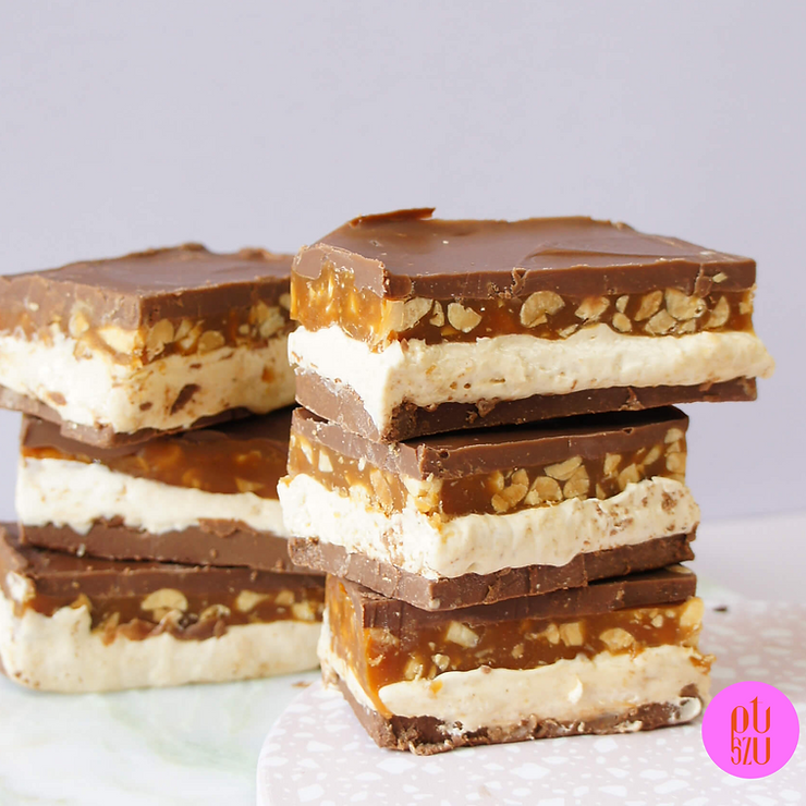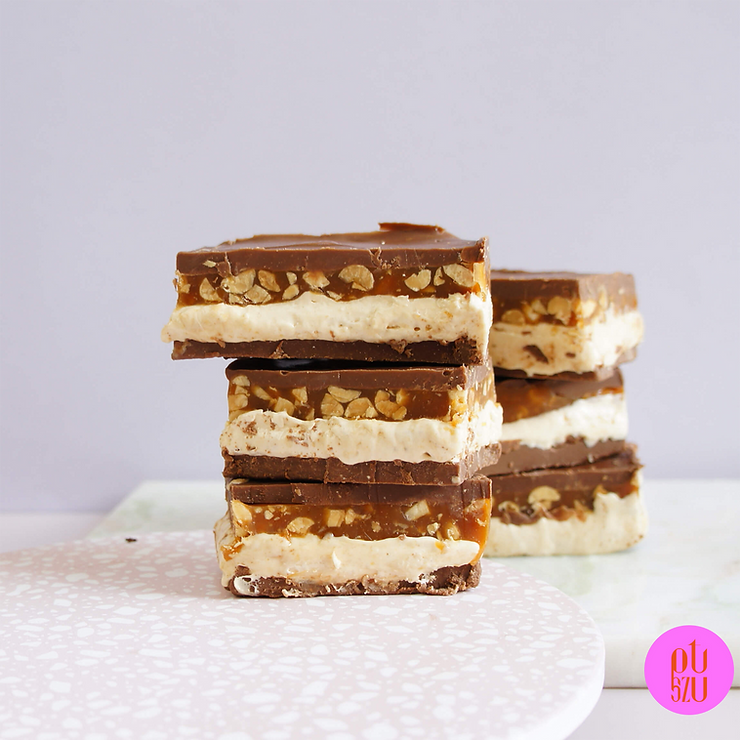 Warstwa czwarta (polewa): Rozpuść pozostałą część czekolady i masła orzechowego i wylej na warstwę karmelową. Zabezpiecz folią i odstaw do zamrażarki na 24 godziny.