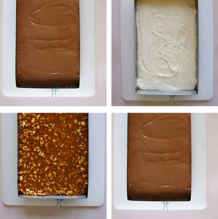 Pierwsza warstwa (polewa): rozpuść połowę czekolady z połową masła orzechowego. Następnie wylej do przygotowanej formy. Rozprowadź równomiernie i odstaw do zamrażarki na 10 minut. W tym czasie przygotuj kolejną warstwę.