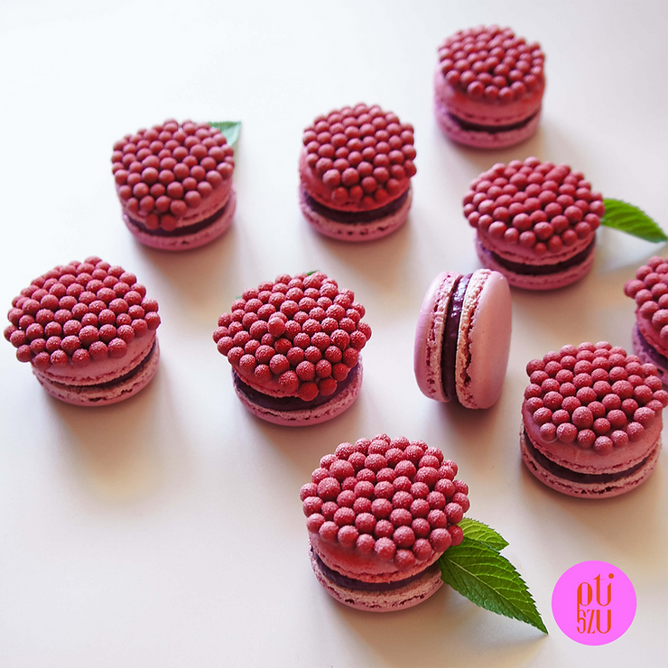 Makaroniki “maliny” wywołują efekt WOW. Jednak ich zrobienie jest czasochłonne. Zaplanuj tak pracę, aby mieć godzinę na ich wyklejanie. Crispearls z firmy Mona Lisa chrupią, dzięki temu makaroniki są niezwykłe i zaskakujące. Krem, który do nich przyrządziłam, to krem z czarnej porzeczki. Jest intensywnie owocowy, z lekkim posmakiem białej czekolady.