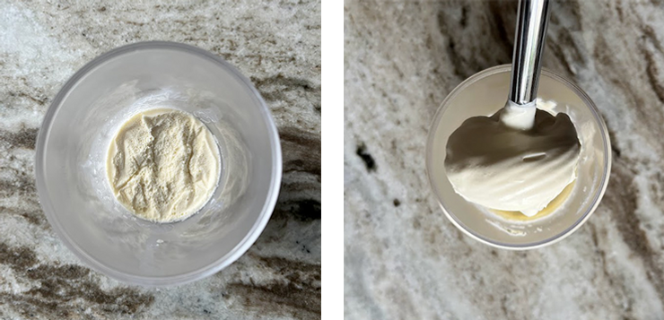 Wylej gorącą śmietankę na czekoladę. Odczekaj 3 minuty. Zblenduj. Dodaj zimną śmietankę B i zblenduj ponownie.