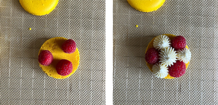 Na jednej połówce z pary wyszprycuj krem w sposób, jaki widzisz na zdjęciu. Pomiędzy ułóż maliny. W środku wyszprycuj żelkę, na niej odrobinę kremu. Weź drugą połówkę makaronika i przykryj nią połówkę z kremem. Przyciśnij lekko, aż góra przyklei się do niego.