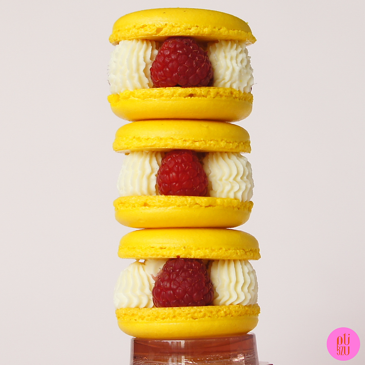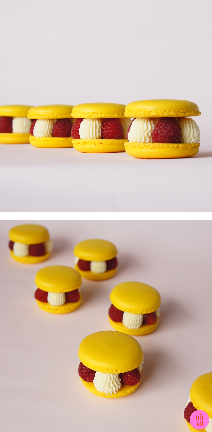 Jakiś czas temu w jednej z warszawskich cukierni jadłam makaronik XL z kremem waniliowym, żelką malinową i malinami. Bardzo mi smakował, więc postanowiłam zrobić podobny deser w domu i podzielić się z Tobą przepisem na niego. Receptura dotyczy makaroników o średnicy 6 centymetrów z ubijanym kremem na białej czekoladzie, któremu możesz nadać dowolny aromat, i żelką malina/ liczi/ róża. Całość idealnie dopełniają świeże maliny.