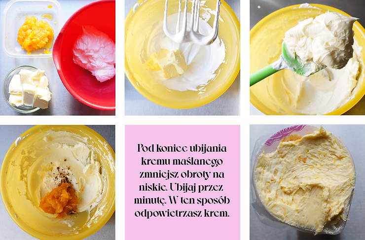 Do puszystego kremu maślanego dodaj cynamon i konfiturę. Ubijaj do połączenia. Krem umieść w rękawie cukierniczym, z okrągłą końcówką Ø 8 mm.