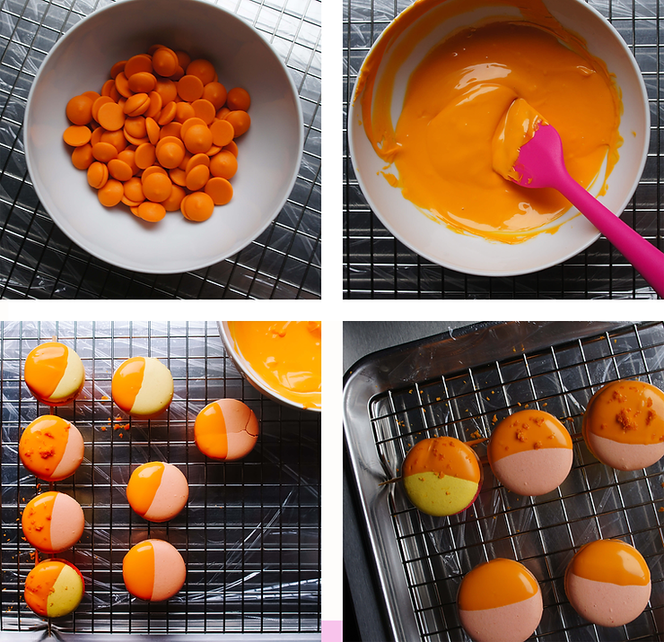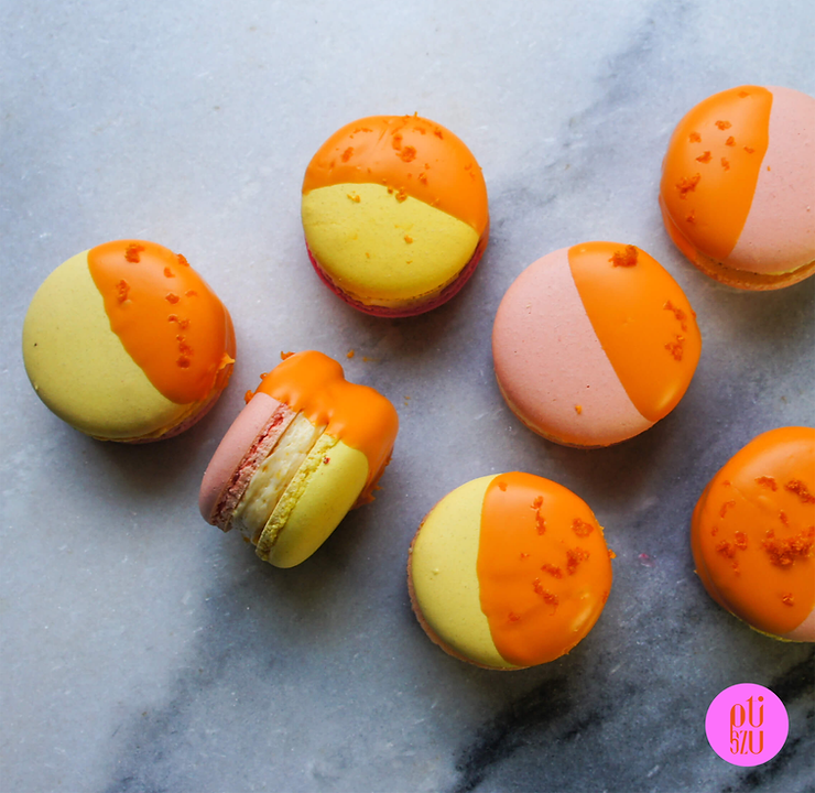 Intensywne kolory i wyraziste smaki. Obok tych makaroników nie da się przejść obojętnie. Główną rolę gra tu krem maślany na bazie konfitury z dyni i pomarańczy, wzbogacony cynamonem. Towarzyszy mu żelka gruszkowa z kawałkami owoców. Całość otulona jest warstwą pomarańczowej czekolady. Brzmi nieziemsko i smakuje tak samo.