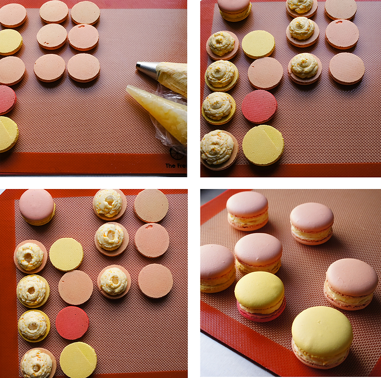 Przygotuj makaroniki do szprycowania. Dobierz je w pary, połóż obok siebie, środkiem do góry.