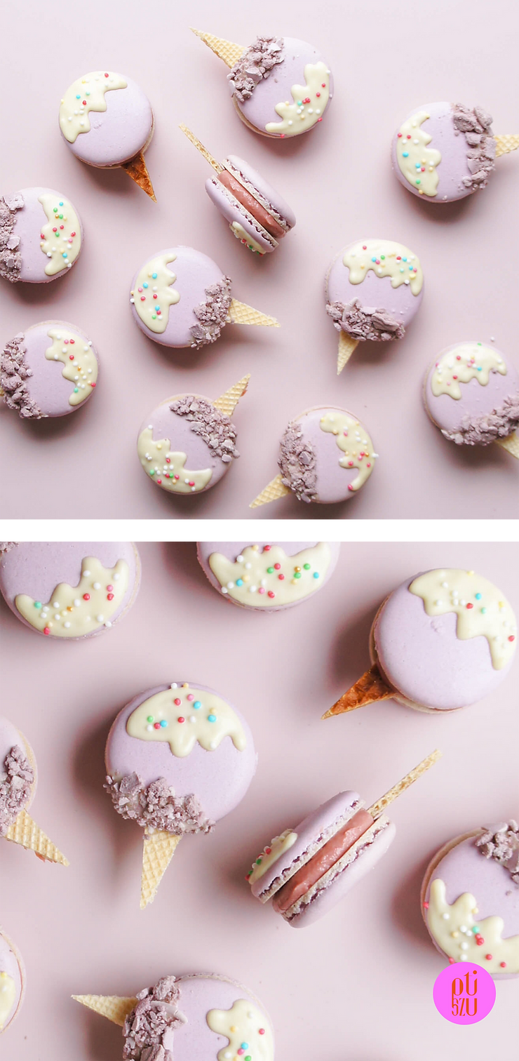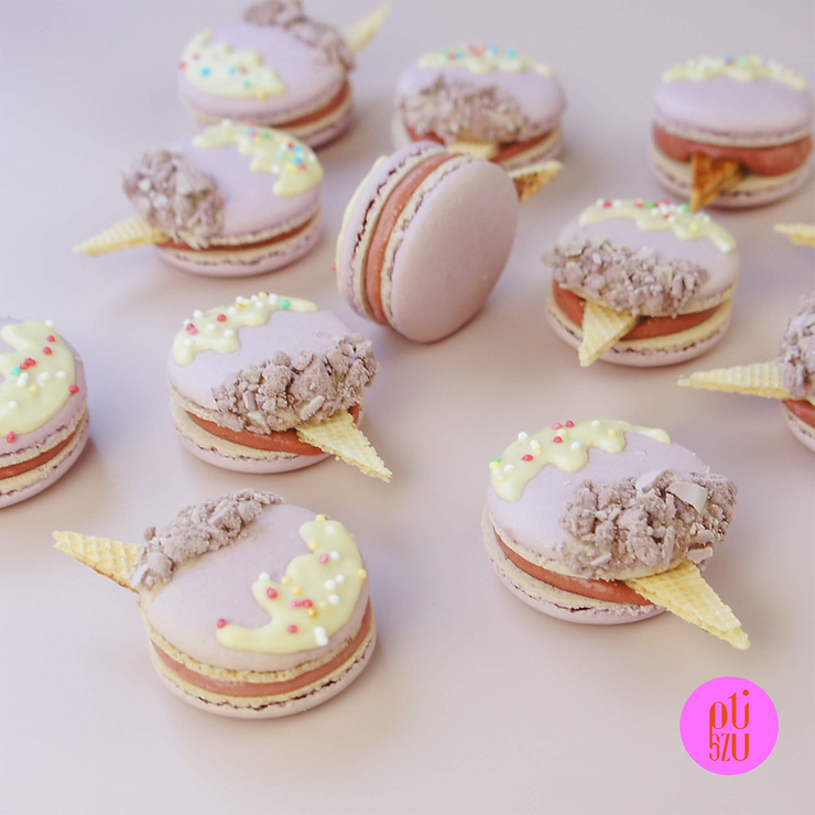 Makaroniki dekorowane na słodkie lody przełożone są kremem truskawkowym na białej czekoladzie. Ma on w sobie jeden magiczny składnik, który pięknie wydobywa smak truskawek na pierwszy plan. Jest to ocet balsamiczny. Kwaśne smaki bardzo często pełnia rolę balansującą i uwypuklającą inne smaki.
