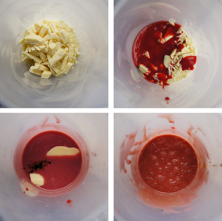 Zagotuj puree z syropem glukozowym. Gotuj do momentu, aż ilość puree zredukuje się o połowę! Puree zacznie intensywnie pachnieć truskawkami. Pamiętaj, żeby nie pomijać tego kroku. Inaczej ganache będzie rzadki.