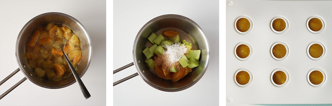 Pozbądź się białej skórki z pomarańczy i umieść je w rondelku. Rabarbar obierz i pokrój w kostkę. Przełóż do rondelka z pomarańczami. Dolej syrop klonowy.