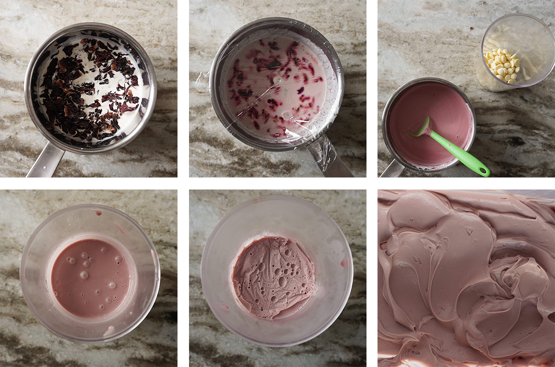 Przygotuj infuzję: śmietankę połącz z hibiskusem i zagotuj. Zdejmij z kuchenki i zabezpiecz rondelek folią spożywczą, odstaw na godzinę. W tym czasie śmietanka wchłonie woń hibiskusa. Przerzuć mieszankę na sito i wyciśnij z niej jak najwięcej śmietanki.