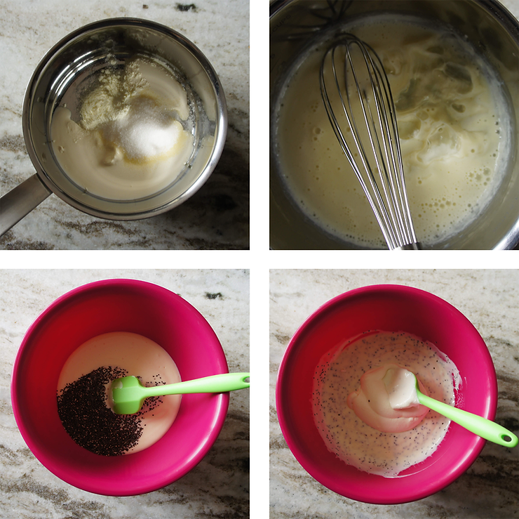 Śmietankę A połącz z cukrem i zagotuj w rondelku. Dodaj odsączoną żelatynę i wymieszaj do rozpuszczenia. Dodaj jogurt z makiem, wymieszaj.