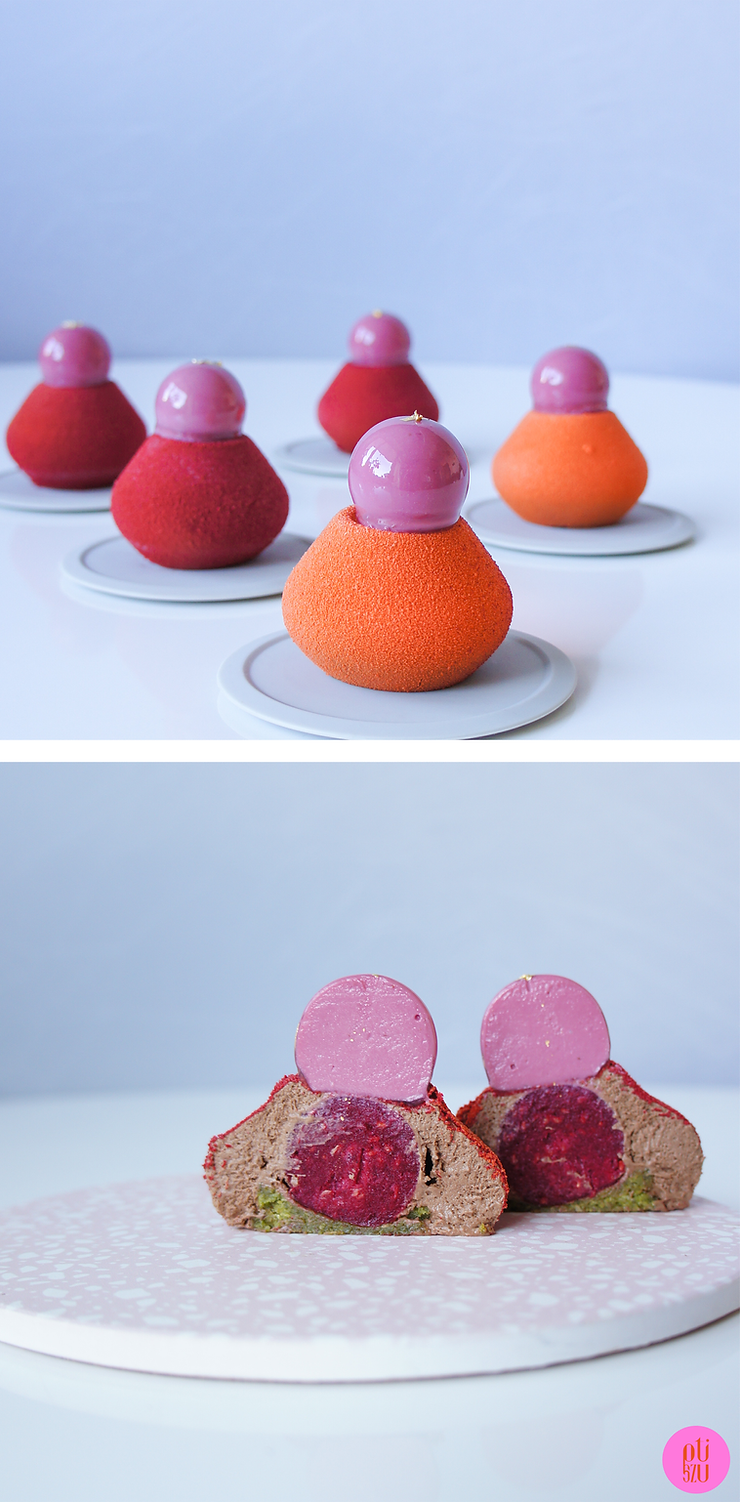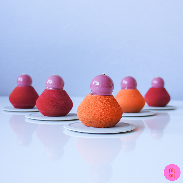Monoporcje zostały przygotowane w formie silikonowej Silikomart FRAGRANCE 115 63 × 63 mm H-45 mm/ śr. 32 mm H-28 mm.