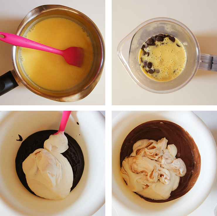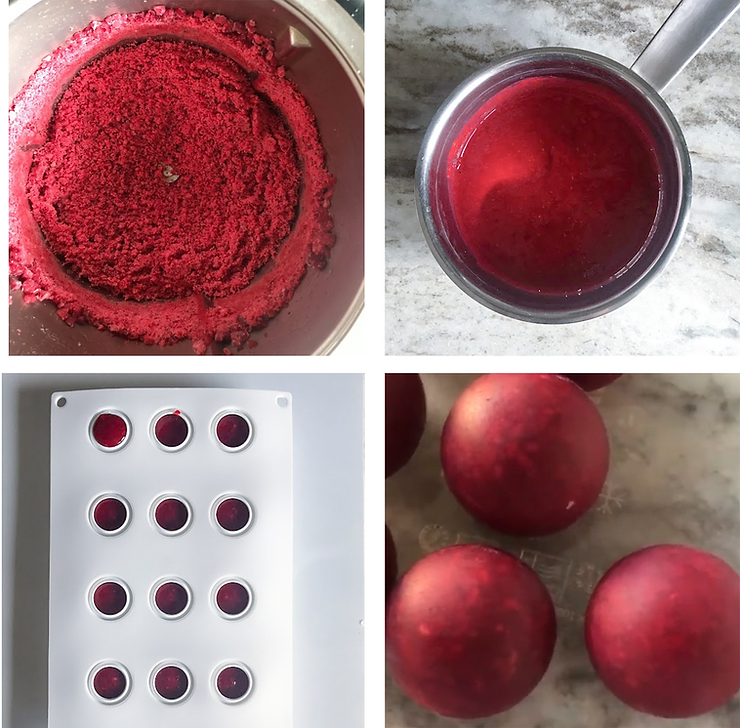 Wylej śmietankę z purée na czekoladę i barwnik. Poczekaj, aż czekolada się rozpuści. Dokładnie wymieszaj krem. Dodaj pozostałą część śmietanki. Zblenduj. Przełóż do rękawa cukierniczego i napełnij formę silikonową (kule o pojemności 20 ml). Włóż do zamrażarki na co najmniej 8 godzin.