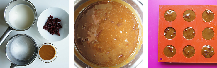 Małą łyżeczką przełóż karmel do formy silikonowej. Wskazówka Ady: użyłam formy z półkulami o pojemności 15 g/każda.
