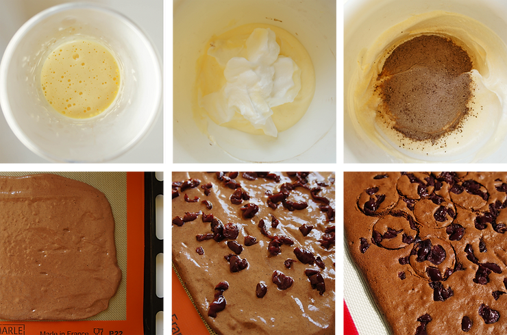 Masę przełóż na matę silikonową położoną na blaszce. Rozsmaruj na grubość 5 mm. Wyrównaj szpatułą. Przekrój wiśnie na pół i rozłóż równomiernie na biszkopcie. Wiśnie lekko wciśnij w masę biszkoptową.