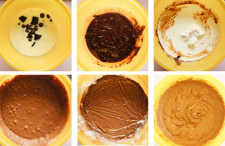 Wylej na posiekaną czekoladę. Odczekaj dwie minuty. Następnie zblenduj do uzyskania jednolitego kremu. Dodaj śmietankę B. Zblenduj. Zabezpiecz folią na powierzchni. Odstaw do lodówki na co najmniej 6 godzin.