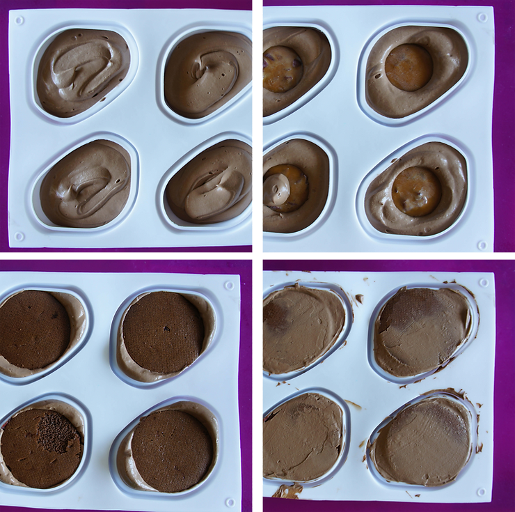 Napełnij do połowy każdą wnękę formy silikonowej (kamień) musem czekoladowym.