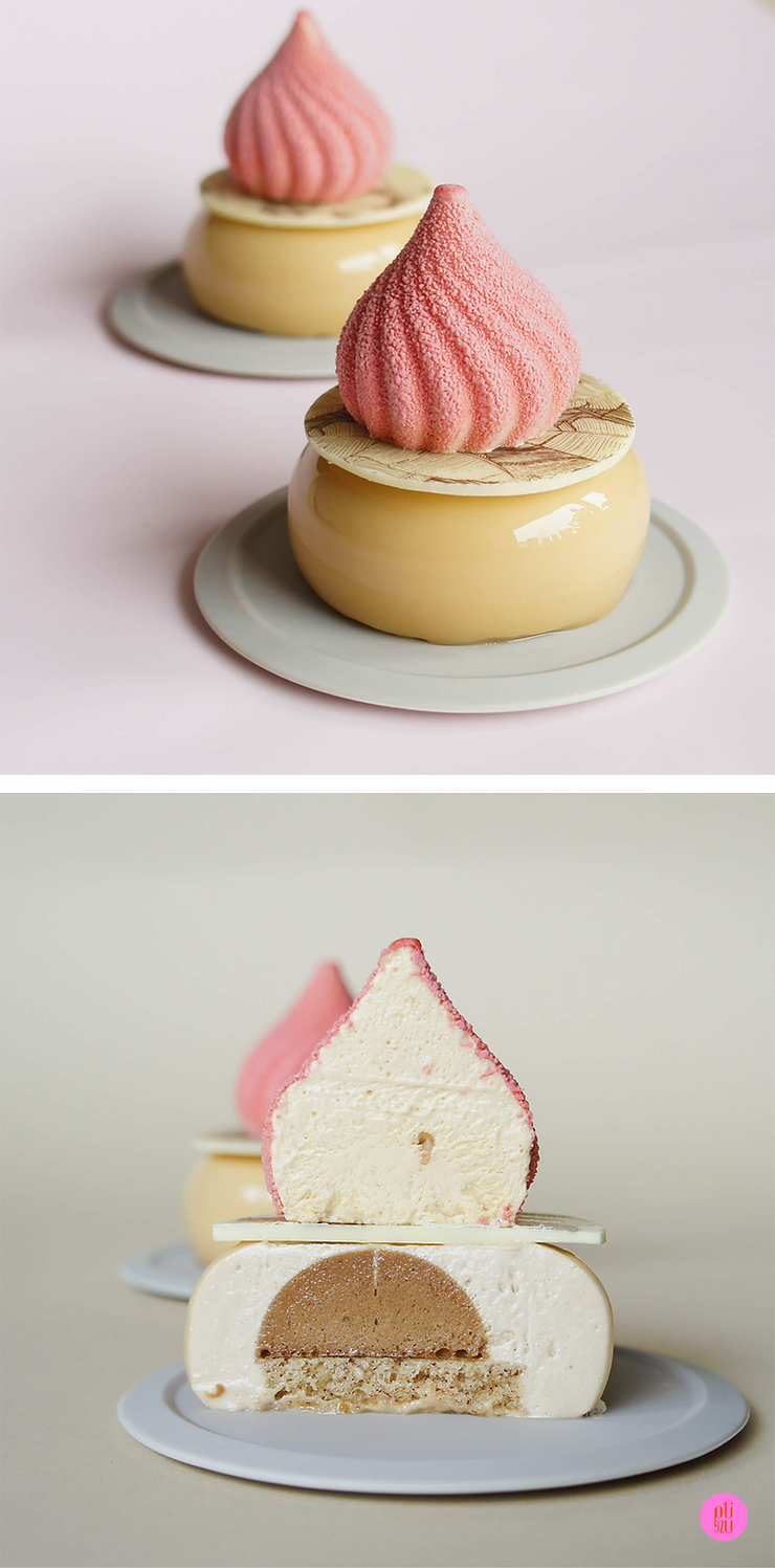 Każdą wnękę formy silikonowej napełnij do połowy musem kawowym. Następnie włóż do niej inserty, wlej odrobinę kremu i połóż krążek biszkoptowy. Dociśnij go lekko tak, żeby znalazł się na równi z końcem formy – nie może wystawać ponad nią. Jeśli jest poniżej, dolej krem i wyrównaj go szpatułką.