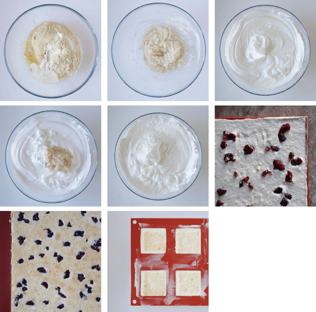 Biszkopt wyjmij z piekarnika, połóż na nim matę silikonową, obróć blaszkę o 180° i połóż na blacie. Delikatnie zdejmij matę, na której pieczony był biszkopt. Kiedy ciasto wystygnie, pokrój je na kwadraty o bokach długości 4 cm.