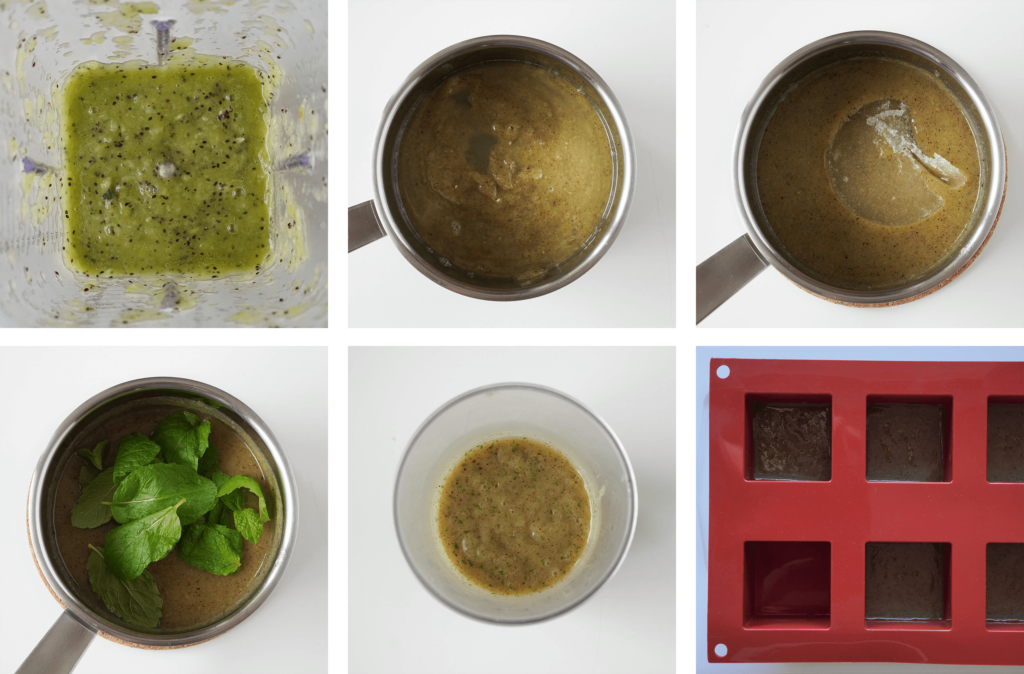 Całość zagotuj, po czym gotuj jeszcze przez minutę, mieszaj od czasu do czasu. Rondelek zdejmij z płyty i dodaj napęczniałą żelatynę, mieszaj do rozpuszczenia. Dorzuć liście mięty i całość zblenduj na gładko.