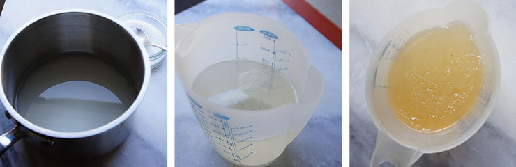 W rondelku umieść wodę, sok z cytryny i cukier A. Podgrzej do temperatury 40°C i dodaj mieszankę cukru z pektyną. Bardzo dokładnie wymieszaj rózgą. Zagotuj i gotuj jeszcze przez minutę. Przelej do plastikowego pojemnika i zabezpiecz folią. Odstaw do lodówki na 12 godzin.