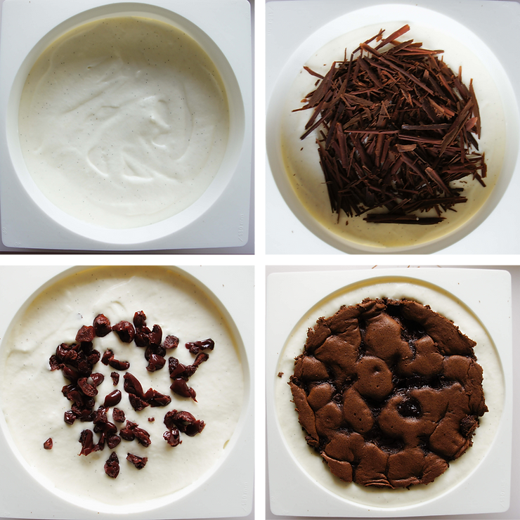 Do formy wlej mus śmietankowy – powinien zakryć dno. Jego warstwa ma grubość około 1 cm. Następnie ułóż na nim czekoladowe płatki. Wylej cienką warstwę musu i ponownie posyp płatkami z czekolady. Czynność powtórz jeszcze raz. Na ostatnią warstwę czekoladowych płatków wyszprycuj bardzo cienką warstwę musu i połóż biszkopt z wiśniami. Biszkopt powinien być na równi z końcem formy, nie może wystawać ponad. Jeśli jest poniżej, dolej mus i wyrównaj szpatułką.