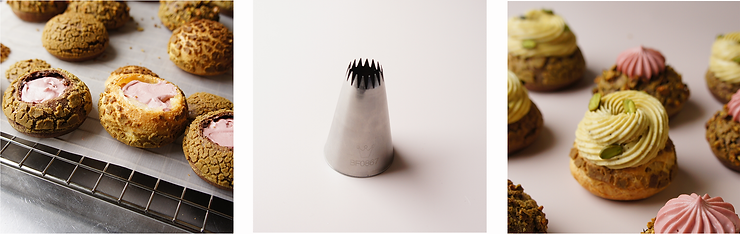 Kremy wyszprycuj według własnych upodobań. Wskazówka Ady: ja bardzo lubię odcinać górną część ptysia. Następnie środek wypełniam jednym krem. Na górze natomiast szprycuję drugi krem, który sprawia, że ptyś wygląda szałowo. Krem pistacjowy jest bardziej stabilny, dlatego sugeruję użyć go do szprycowania na górze.