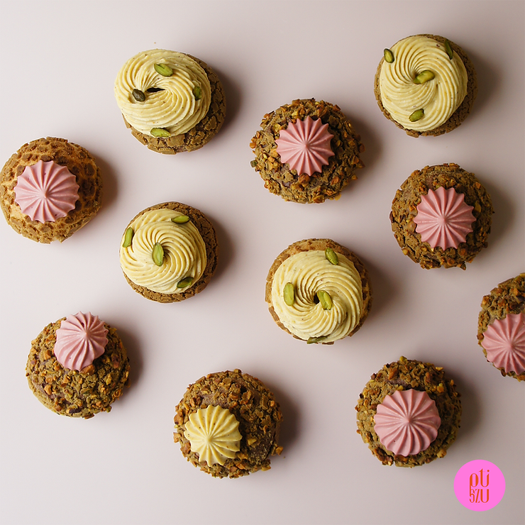 Na jednego ptysia zużyjesz 30 g kremu pistacjowego i 30 g kremu malinowego. Z przepisu wyjdzie około 20 ptysi.