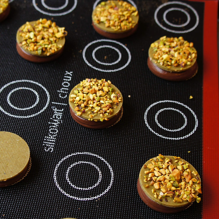 Jeśli chcesz na kruszonkę położyć posiekane pistacje, zrób to teraz. Posmaruj kruszonkę białkiem i posyp pistacjami. Połóż matę silikonową na placek i lekko dociśnij. Odłóż do zamrażarki na 10 minut.