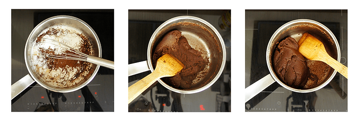 Przesiej mąkę z kakao do miski, wymieszaj. Gotujące się mleko ściągnij z kuchenki, następnie dodaj mąkę z kakao. Wymieszaj rózgą składniki do uzyskania jednolitej masy i odstaw garnek na płytę (średnią moc). Nieustannie mieszaj ciasto szpatułką gdy się podgrzewa, aż do momentu powstania cienkiej warstwy z ciasta na dnie garnka. Gotowe ciasto powinno błyszczeć się i być sprężyste. Ten etap trwa około 2 minuty.
