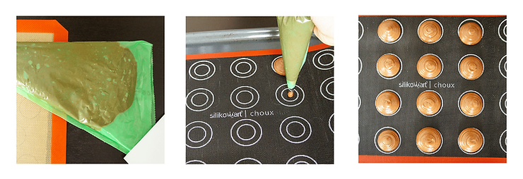 Wyszprycuj ciasto na blachę wyłożoną perforowaną matą do pieczenia (bądź papierem do pieczenia). Jeśli nie masz maty z narysowanymi kółkami, weź okrągłą foremkę o średnicy 3 cm. Górę foremki umieść w mące i odciskaj jej ślady na macie/papierze do pieczenia. Dzięki temu ptysie będą podobnej wielkości.