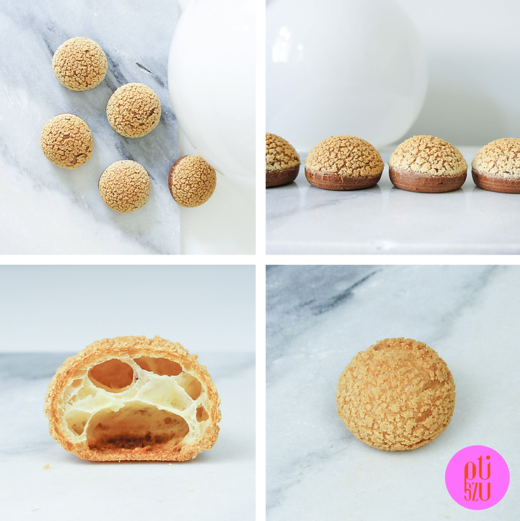 Na każdego ptysia połóż jedno kółko kruszonki. Lekko przyciśnij.