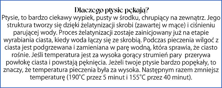 Ptysie piecz w piekarniku nagrzanym do 190°C przez 5 minut, następnie zmniejsz temperaturę do 160°C i piecz kolejne 45-50 minut. Piecz ptysie w trybie grzania góra – dół, bez termoobiegu. Dzięki temu będą rosły równomiernie.