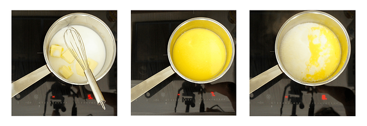 W rondelku umieść: mleko, wodę, cukier, sól i masło. Używaj średniej mocy, aż do rozpuszczenia masła. Następnie zwiększ moc kuchenki i zagotuj.