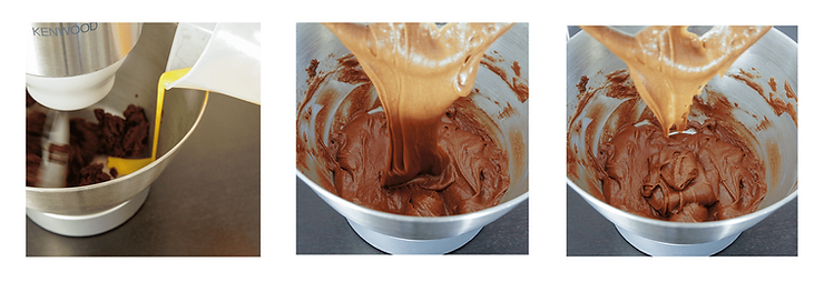 Ustaw obroty miksera na średnie. Zacznij dodawać zblendowane jaja stopniowo. Na początek wlej połowę, poczekaj do całkowitego połączenia. Następnie wlej połowę z pozostałej części. Od tego momentu włącz swoją czujność!!! Dodawaj jaja małymi partiami i sprawdzaj konsystencję ciasta. Unieś mieszadło do góry, ciasto jest gotowe jeśli opada na dno misy swobodnym, nieprzerwanym strumieniem, jednocześnie nie łącząc się z masą w misie. Ciasto, które pozostanie na końcówce miksera powinno przypominać swoim kształtem literę „V”.
