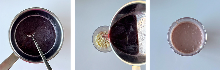 W miseczce umieść żółtka. Do żółtek dodaj odrobinę gotującej się mlecznej mieszanki. Intensywnie mieszaj rózgą. Kiedy dolejesz całość, przelej zawiesinę z powrotem do garnka. Podgrzewaj na średniej mocy, nie przerywając mieszania. Podgrzej do 82°C.