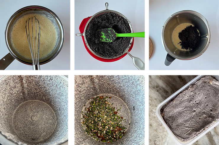 Dodaj masę żelatynową i wymieszaj do rozpuszczenia. Mieszankę przelej na mak. Blenduj do momentu, aż wytworzy się emulsja – całość zgęstnieje, a mak połączy się z kremem angielskim. Dorzuć pistacje i morele. Wymieszaj. Użyj po przygotowaniu lub umieść w lodówce. Przed użyciem wymieszaj.
